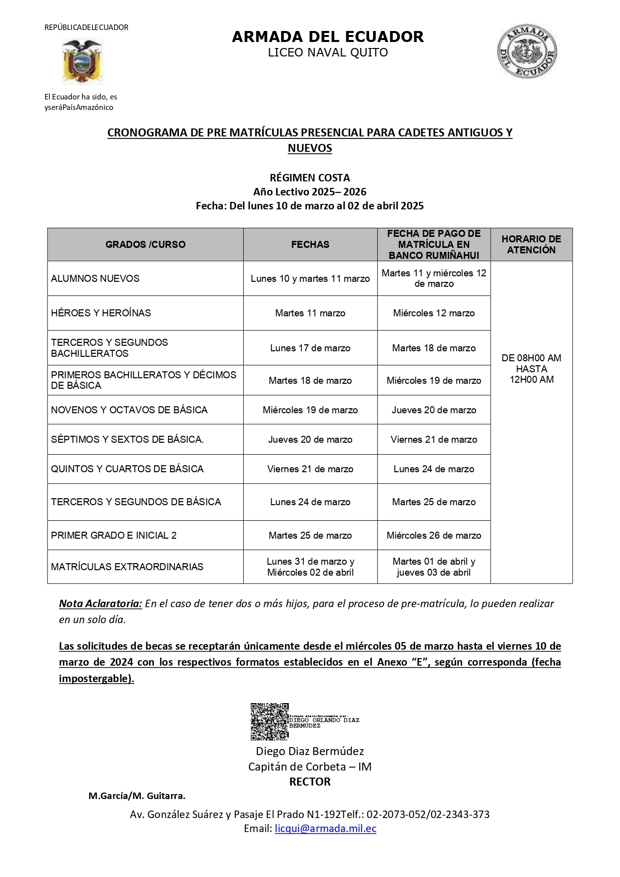 UNIDAD EDUCATIVA DE FUERZAS ARMADAS LICEO NAVAL DE QUITO “CMDTE. CÉSAR ENDARA PEÑAHERRERA” INFORMACIÓN DE MATRICULAS AÑO LECTIVO COSTA 2025-2026