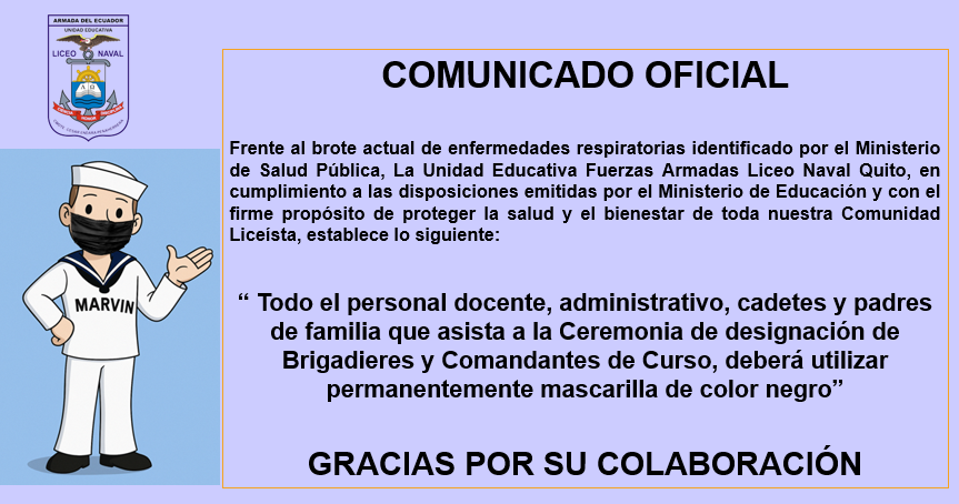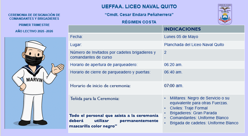 La UEFFAA. Liceo Naval Quito, extiende una cordial invitación a la ceremonia de designación de Brigadieres y Comandantes de Cursos – Primer Trimestre, Régimen Costa, quienes han sido seleccionados por su porte militar, liderazgo, disciplina y excelencia académica.